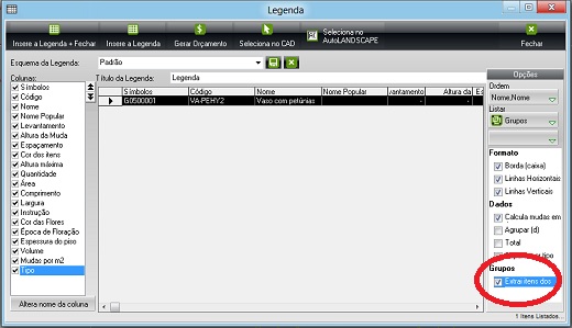 Os grupos inseridos em seu projeto são listados como itens na legenda do AutoLANDSCAPE. Como qualquer outro item tratado pelo programa.