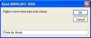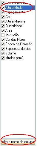 Para alterar o nome das colunas, basta selecionar a coluna a ser alterada e clicar no botão, "Altera nome da coluna". Aparecerá uma caixa de texto; basta, então, digitar o novo nome e clicar em OK. Como exemplo, trocaremos o nome da coluna "Altura Muda" para Porte da Muda. Primeiro selecionamos o item "Altura da Muda" e depois clicamos em "Altera nome da coluna".