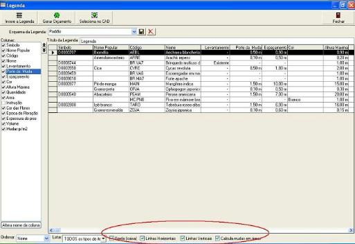 Nestes campos, um muito importante é o "Calcula Mudas em áreas". Com esta opção, quando você insere um item em áreas, este mesmo item pode ser calculado em unidades/mudas. Você tem a opção de mostrar a quantidade em unidades e em área juntos ou apenas a quantidade; basta deixar o campo marcado. A tela de legendas do sistema irá sempre lhe mostrar os dois resultados, mas ao inserir um item, o sistema respeitará o que você tiver configurado anteriormente.