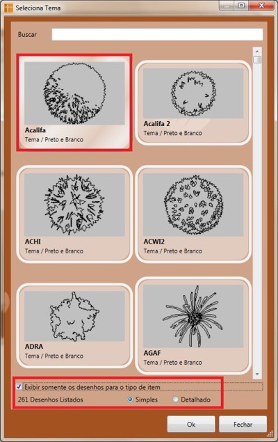 Perceba que na parte inferior desta tela existe a opção Exibir somente os desenhos para o tipo de item, deixando esta opção marcada o programa exibirá somente os desenhos que se assemelham à planta selecionada. Também é possível escolher entre as opções simples e detalhado.