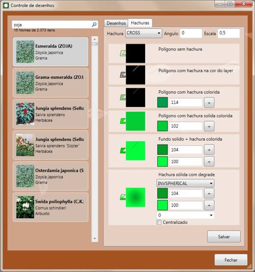A tela de controle de desenhos mostra ao lado esquerdo a espécie que está selecionada, permite buscar por nomes popular ou científico e exibe ao lado direito duas abas, a desenhos e a hachuras.
