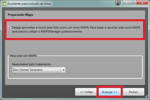 Fique atento as informações que aparecem nas telas, pois elas são muito importantes e vão influenciar na forma que a foto será cadastrada. Neste caso a opção Incluir a foto também como MAPA inclui a foto direto no maps manager para ser editada, porém esta função só é valida para clientes que utilizam o PhotoLANDSCAPE.