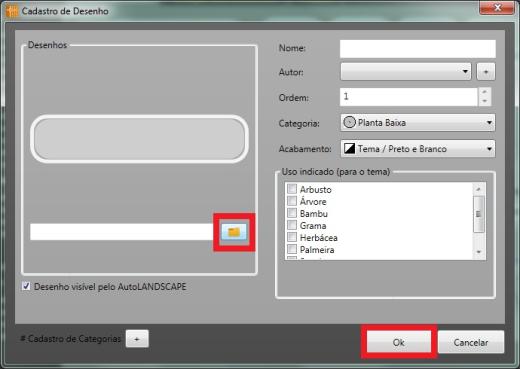 A tela de cadastro de desenhos será aberta e ao lado esquerdo, na caixa Desenho, existe um campo com um icone de uma pasta para encontrar o arquivo.