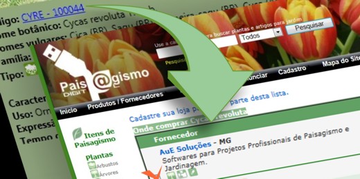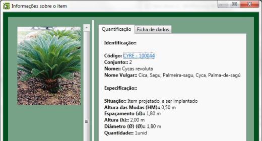 Na aba Ficha de Dados você acessa as informações técnicas (botânicas) detalhadas do item selecionado. O interessante desta tela é que o campo código é um link direcionado para o site www.paisagismodigital.com.br, e clicando neste link você pode visualizar os fornecedores do item.