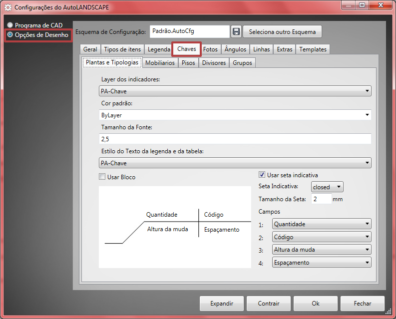 3º Passo – Nesta tela podemos configurar as chaves para Plantas, Mobiliários, Pisos, Divisores, etc... de forma separada. Também podemos configurar os nomes de layers, cores e texto. Para escolher qual informação irá aparecer na chave, mude os campos na caixa indicação.