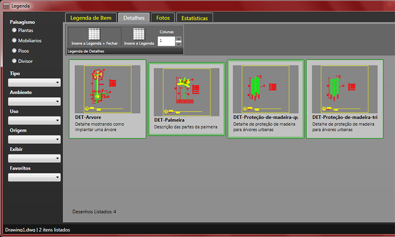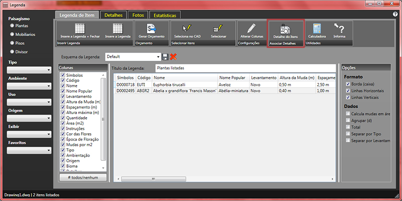 Uma das novidades da nova versão do AutoLANDSCAPE e do HydroLANDSCAPE é que o detalhamento será vinculado aos itens. Sendo assim, a inclusão dos desenhos de detalhes será automática, como o quantificar e gerar legenda do software. Isto permitirá desenvolver um projeto mais detalhado, com muitas informações importantes sem aumentar nada no tempo de desenvolvimento. Com as novas versões dos softwares você fará mais com a mesma praticidade e facilidade de antes. Veja abaixo como é simples associar os detalhes aos itens: