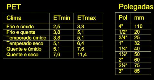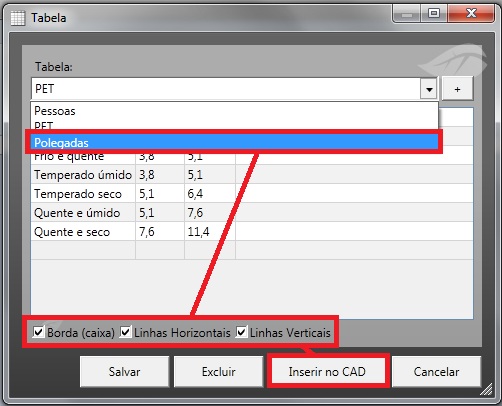 Este campo tabelas vem com duas opções pré-definidas, a PET e a Polegadas.