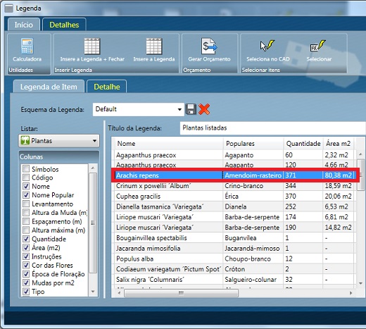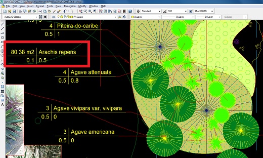 Em uma primeira análise, ao revisar todo o nosso projeto, temos a impressão de que o AutoLANDSCAPE fez o cálculo errado deste item, pois ao inserir a chave de identificação em todas as áreas hachuradas, percebemos apenas uma única área com o item Arachis repens, exatamente a área de 80,38 m2.