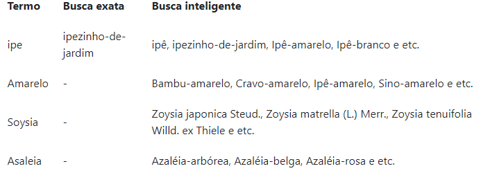 Esse tipo de busca vai pesquisar por uma palavra exata e na ordem exata. Por exemplo, uma pesquisa por Abelia x grandiflora ´Francis excluirá itens que se referem a somente Abelia x grandiflora.
