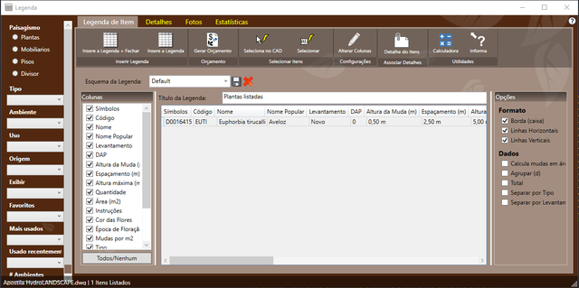 Uma das principais funções do AutoLANDSCAPE é a quantificação. Assim, a tela onde é feita a quantificação e inserida a legenda no CAD possui muitas opções. Vamos ver nesta seção.
