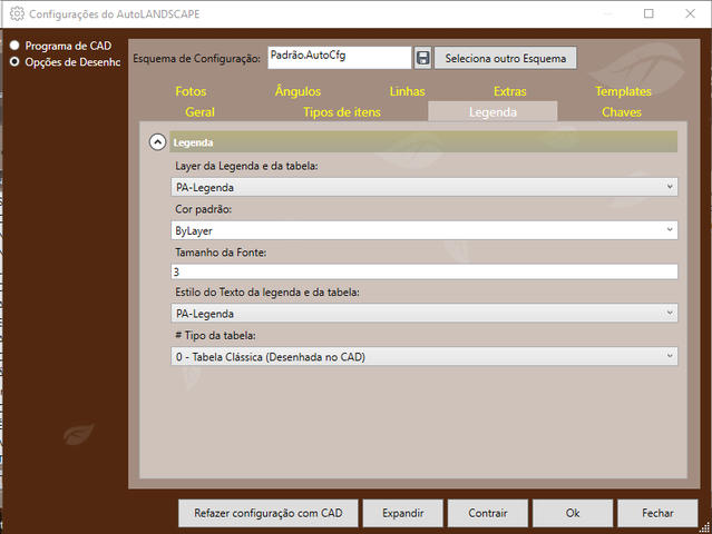 1) Na tela de configuração, selecione Opções de desenho e em seguida a aba Legenda.