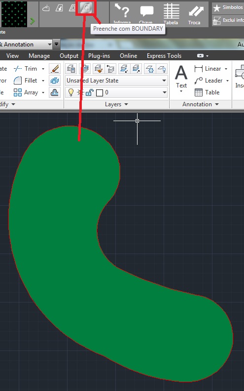 Agora que criamos a forma com a ferramenta pline podemos preenchê-la utilizando o boundary.