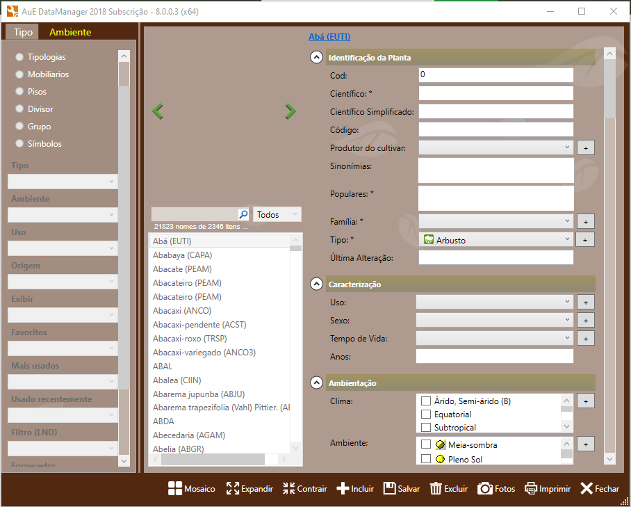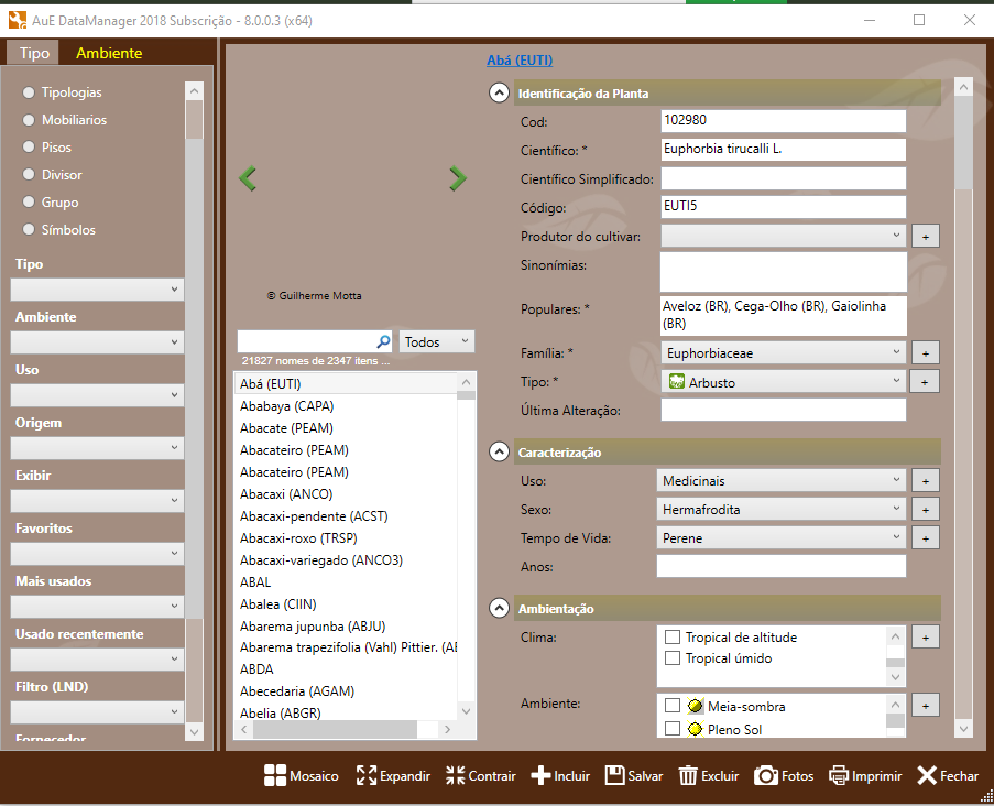 O AutoLANDSCAPE possui um extenso banco de dados composto por mais de duas mil espécies de plantas. É uma boa quantidade certo? Mas o que chama mais atenção neste banco de dados é que são espécies que são encontradas no mercado brasileiro, e além disto, a AuE Soluções emprega esforços para minimizar o tempo de busca por estes itens, pois sabe que para o paisagista, produtividade é muito importante. Sendo assim, o banco de dados da AuE Soluções possui detalhes importantes que podem ser filtrados na hora de encontrar o item ideal, e mais importante, possui ligação com o site www.paisagismodigital.com, também desenvolvido pela AuE Soluções, que permite encontrar fornecedores.