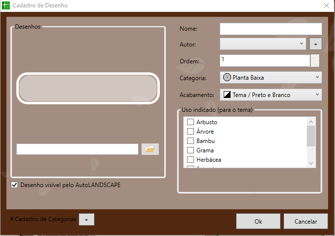 A tela de cadastro de desenhos será aberta e ao lado esquerdo, na caixa Desenho, existe um campo com um icone de uma pasta para encontrar o arquivo.