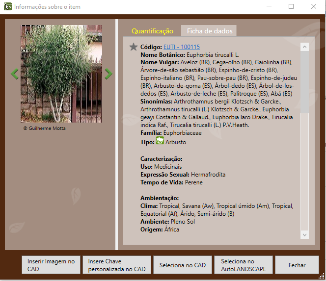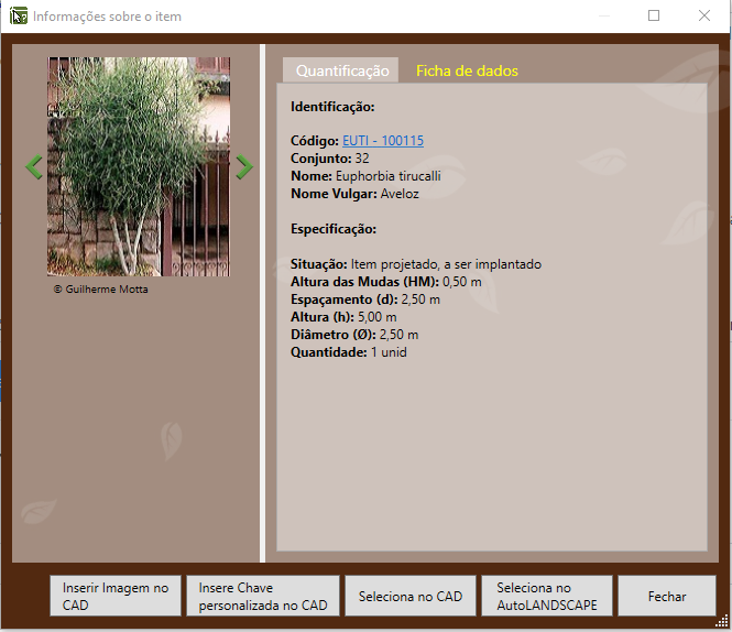 Na aba Ficha de Dados você acessa as informações técnicas (botânicas) detalhadas do item selecionado. O interessante desta tela é que o campo código é um link direcionado para o site www.paisagismodigital.com.br, e clicando neste link você pode visualizar os fornecedores do item.