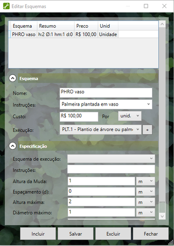 Em seguida vamos inserir um novo esquema para esta palmeira, para que possamos alterar a altura da planta. Para fazer este tipo de inclusão, clique na caixa mostrada abaixo e escolha a opção EDITAR ESQUEMAS.