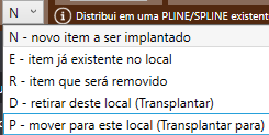 Além disso, podemos definir a característica da espécie em relação ao projeto. Para isso basta clicar na caixa de seleção, na parte inferior da aba de configuração de esquemas e escolher (se for o caso) em que categoria o item se encaixa. Utiliza-se a seguinte definição: "N - novo item a ser implantado"; "E - item já existente no local"; "R - item que será removido"; "D - retirar deste local (Transplantar)" e "P - mover para este local (transplantar para)".