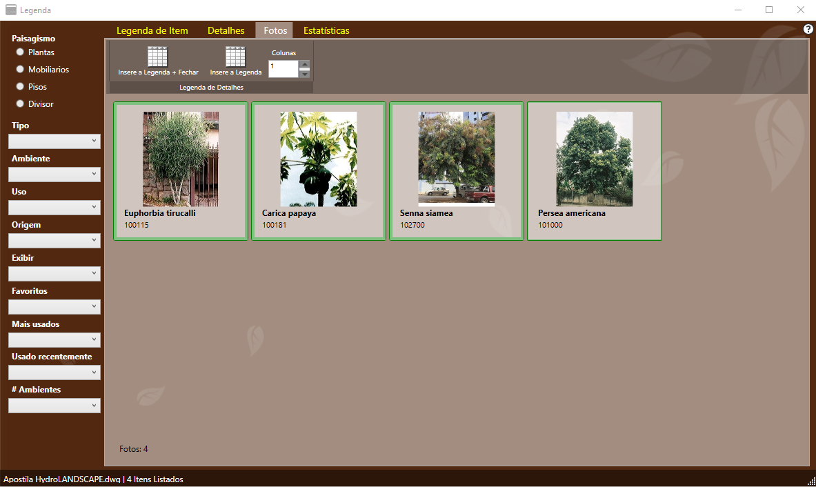 Pela tela de inserção de legendas que possui uma aba chamada fotos que permite inserir as fotos dos itens no CAD com mais opções de personalização. Por exemplo, por esta tela é possível selecionar uma quantidade de colunas de exibição das fotos e também escolher qual foto da planta será inserida.