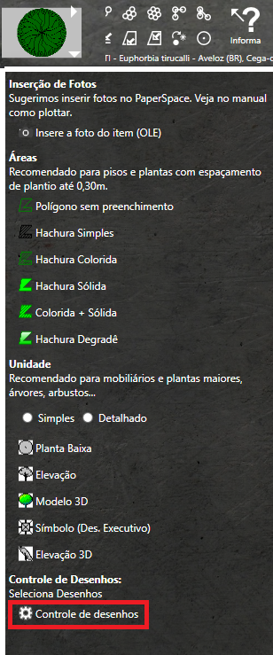 Agora que estamos com o item desejado selecionado vamos escolher o tipo de representação para ele. No centro da barra do AutoLANDSCAPE nós podemos ver um botão com um desenho de item e uma seta ao lado direito. O desenho que aparece neste botão é a representação que está selecionada para esse item. Clicando neste botão, o programa irá exibir várias opções, como inserção de fotos, inserção de unidade ou inserção em áreas, mas o que eu quero mostrar nesta matéria é a opção que está um pouco mais abaixo, o controle dos desenhos: