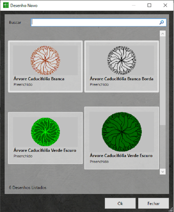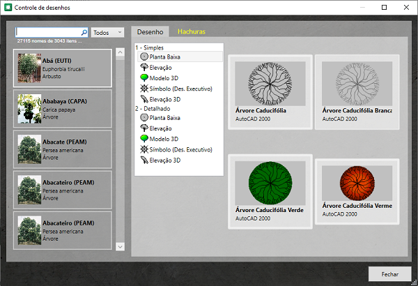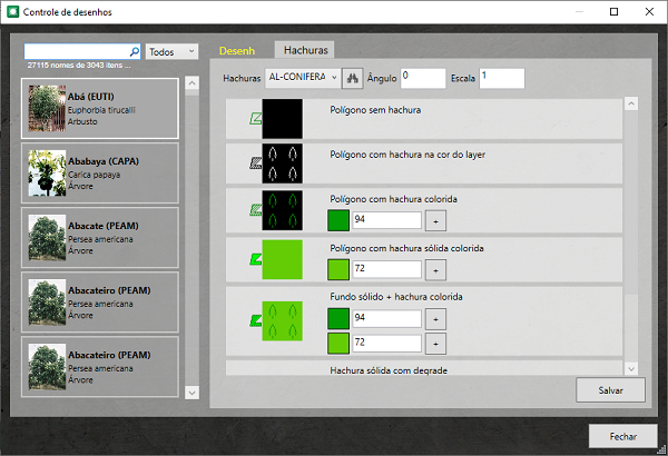 A tela de controle de desenhos mostra ao lado esquerdo a espécie que está selecionada, permite buscar por nomes popular ou científico e exibe ao lado direito duas abas, a desenhos e a hachuras.