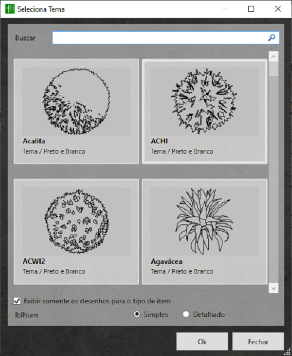 Perceba que na parte inferior desta tela existe a opção Exibir somente os desenhos para o tipo de item, deixando esta opção marcada o programa exibirá somente os desenhos que se assemelham à planta selecionada. Também é possível escolher entre as opções simples e detalhado.