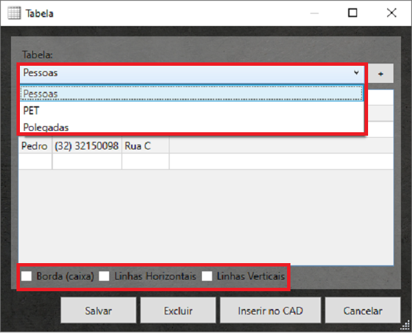 Este campo tabelas vem com três opções pré-definidas, Pessoas, PET e a Polegadas. Depois de selecionar a opção desejada, você pode escolher se a tabela terá linhas verticais, horizontais ou borda.