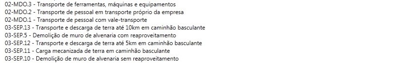 São informações vinculadas ao projeto, sem ter uma ligação com apenas um determinado tipo de item. Estas ações podem ser o transporte de ferramentas, transporte de pessoal, demolição de muro, aterro, terraplanagem... São informações de suma importância e que devem ser quantificados no orçamento.