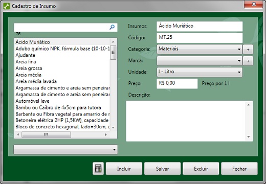 • Categoria: CalcLANDSCAPE | CalcLANDSCAPE 2012 | CalcLANDSCAPE 2012: Conheça a Tela do Programa | CalcLANDSCAPE 2012: Aba Cadastro | CalcLANDSCAPE 2012: Como cadastrar Insumos