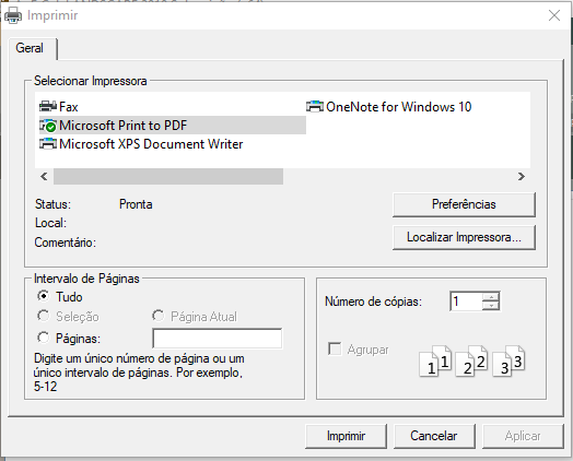 ou caso tenha escolhido utilizar a ferramenta do windows 10 escolha a opção Microsoft Print to PDF, e clique em Imprimir, para gerar o arquivo PDF.