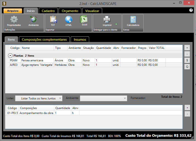 Esta aba exibe a lista de itens do orçamento, você pode alterar os preços, quantidade, marcar se o item já existe no local ou se é novo. Nesta aba também é mostrada as composições ligadas ao tipo de item (ex.: Composição Plantio de arbusto ou trepadeira para um arbusto). Nos botões com o ícone de "+" você pode incluir novos itens ou composições, nos botões com ícone de "-" você exclui um item ou composição que estiver selecionada.