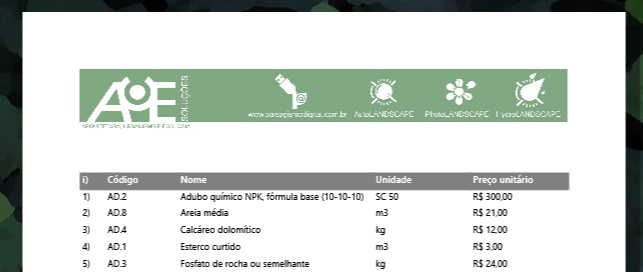 Ao terminar o orçamento, o CalcLANDSCAPE apresentará relatórios detalhados de orçamentos e de itens. Em comparação com as versões anteriores dos programas, os relatórios mudaram muito, pois agora eles levam uma tela para edição que permite alterar cores, fonte e tabelas.