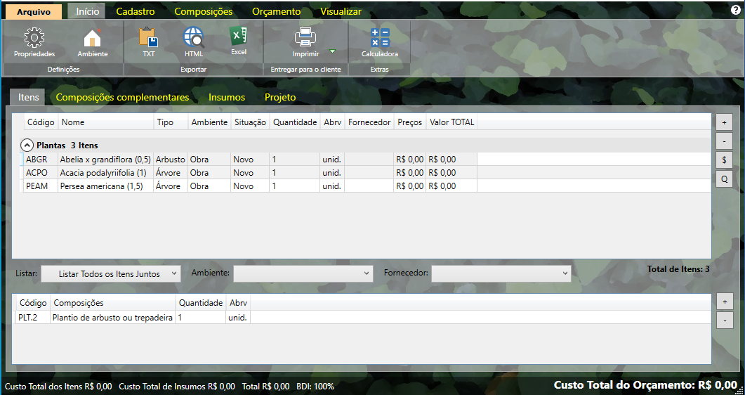 Como as espécies do banco de dados do sistema levam informações botânicas, o programa consegue quantificar e gerar o orçamento com os itens que foram inseridos no projeto.