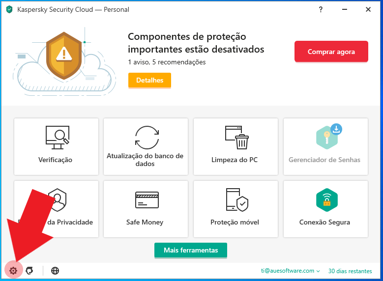 1º Passo – Na tela do antivírus, clique na engrenagem no canto inferior esquerdo para abrir as configurações.