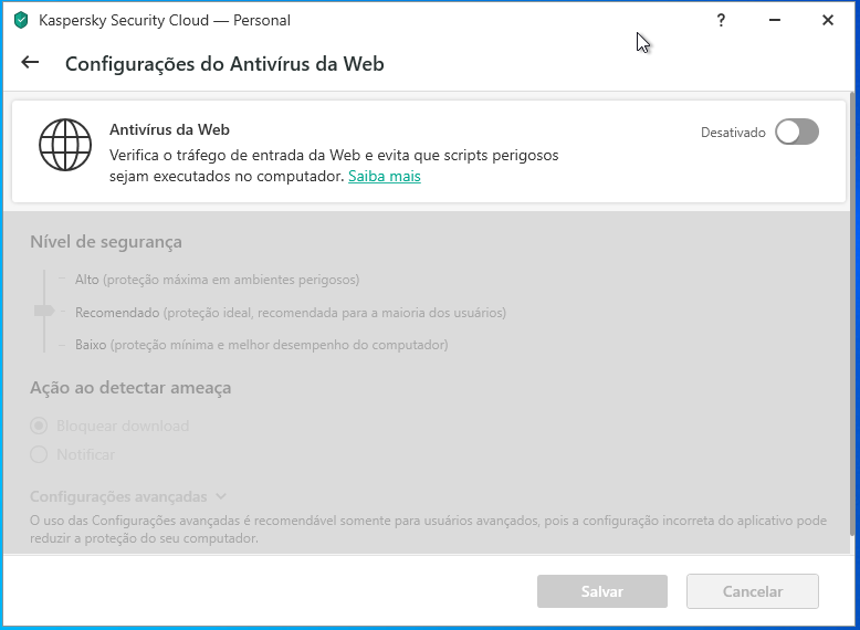 3º Passo – No canto superior direito, clique no interruptor para desativar a proteção web e logo em seguida clique em salvar.
