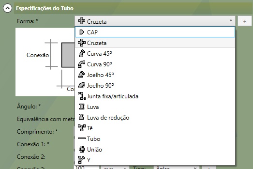 Os tipos de conexões podem ser vistos no HydroMANAGER, em "Especificações do Tubo" e logo após em "Forma".