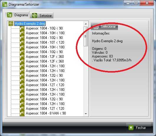 O próximo passo é a setorização do projeto. Na tela Diagrama/Setorizar o HydroLANDSCAPE apresenta todos os equipamentos de irrigação inseridos no projeto. Neste caso, nenhuma origem, nenhuma válvula e 83 aspersores com uma vazão total de 17,7m3/h.