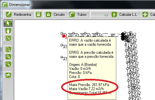 Após calcular o projeto, o HydroLANDSCAPE irá destacar a origem para informar os valores necessários obtidos pelo cálculo. Neste ponto, basta clicar na origem para obter os dados de pressão e vazão necessários na bomba. Veja na tela abaixo: