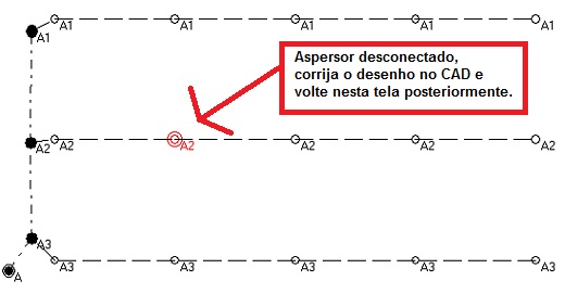 Isto ocorre porque a linha do tubo tem de começar ou acabar no centro do símbolo que representa o aspersor, válvula ou origem. Portanto, para corrigir seu projeto, basta sair da tela de dimensionamento e mover o início ou fim da linha que representa o tubo para o ponto de inserção do aspersor/válvula.