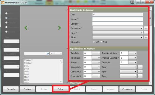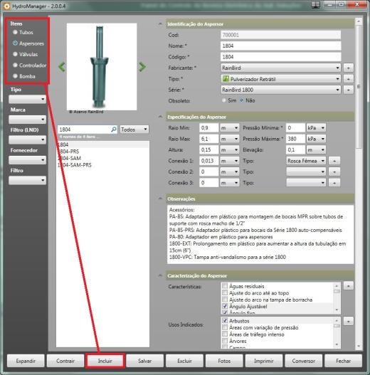 A tela do Hydro Manager abrirá, e você encontrará as opções de item ao lado esquerdo e a opção de incluir na parte inferior da tela. Marque a opção aspersor do lado esquerdo e clique em incluir.