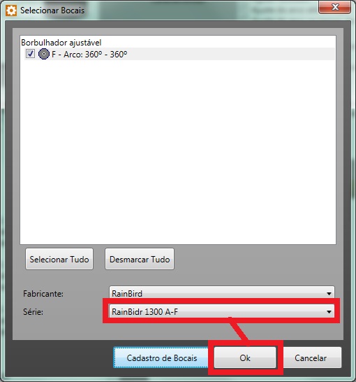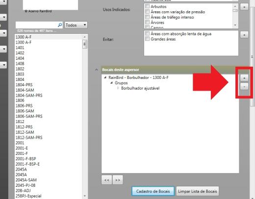 Para incluir um bocal o procedimento também é bem simples. Vamos descer a barra de rolagem até encontrar a opção Bocais deste aspersor.