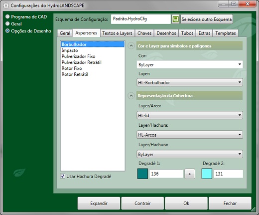 A cor e o layer da hachura degrade usada para mostrar a cobertura, ou a área que o aspersor irá molhar. Você também pode desmarcar a opção "usar hachura degrade" para que o programa não desenhe mais estas hachuras.