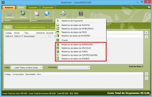 O HydroLANDSCAPE permite exportar o orçamento gerado para arquivos .TXT e .HTML. Para exportar basta selecionar uma das opções e escolher onde salvar o arquivo.