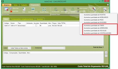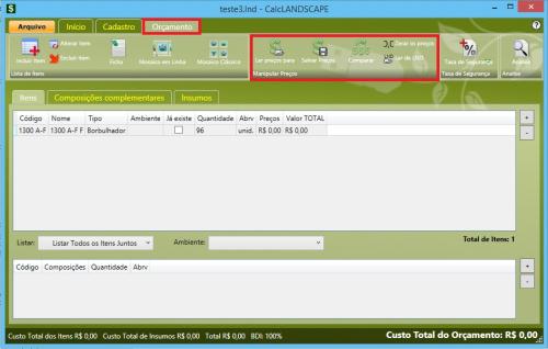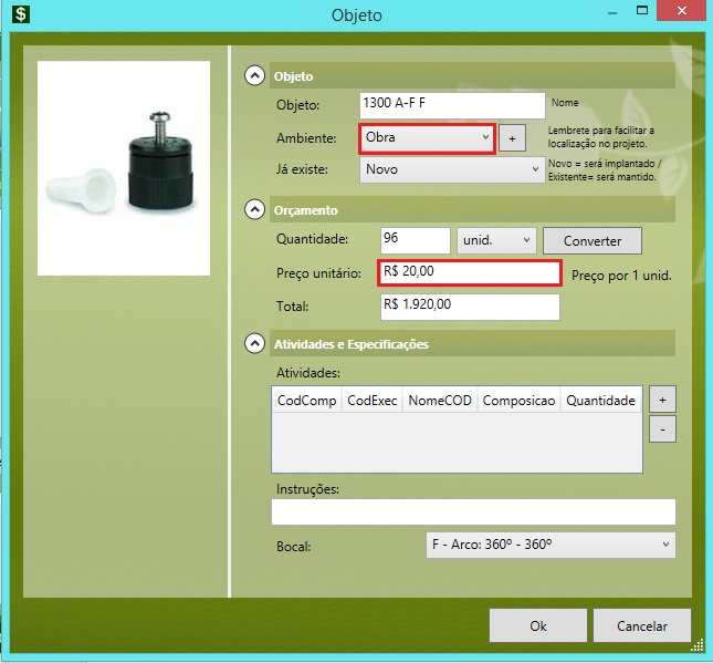 Aqui podemos modificar o valor do item, o tipo de ambiente e outras opções. Ao mudar o valor do item, clique em Ok para voltar a janela de Orçamento, que agora estará com o novo valor para os itens escolhidos.