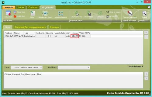 Os preços dos equipamentos devem ser indicados na coluna apropriada da tabela, o HydroLANDSCAPE leva em seu banco de dados todos os itens sem preço (preço=0). Porém os preços podem ser armazenados no banco de dados do programa para serem reutilizados.