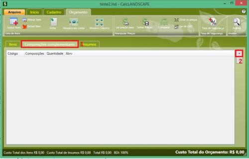 Por exemplo, pode ser necessário preparar o terreno antes de iniciar a obra, aterros, desaterros, capina dentre outras tarefas podem ser lançadas em seu orçamento na aba Composições complementares. Quando abrir a aba, clique no botão +.