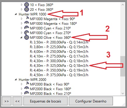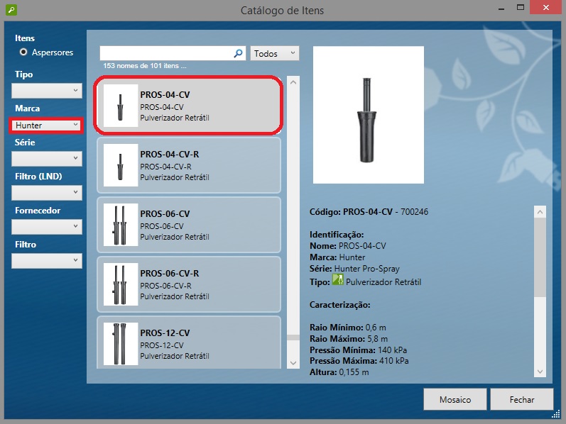 Os novos aspersores podem ser selecionados através do catálogo, como mostrado na figura abaixo: