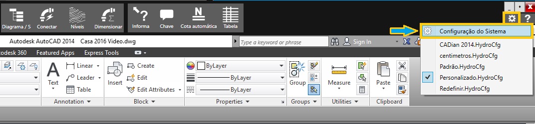 Para que a tabela de quantificação dos itens apareça no AutoCAD. é necessário configurar o modo de formatação da tabela, para isso basta clicar no ícone de engrenagem e em seguida na Configuração do Sistema como mostra a imagem abaixo.