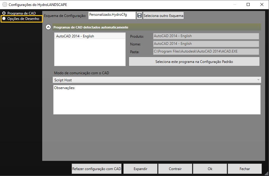 Na janela com a tela de Configuração do HydroLANDSCAPE, selecione Opção de Desenho. Ao selecionar esta opção logo em seguida irá aparecer outras opções e informações no quadro.