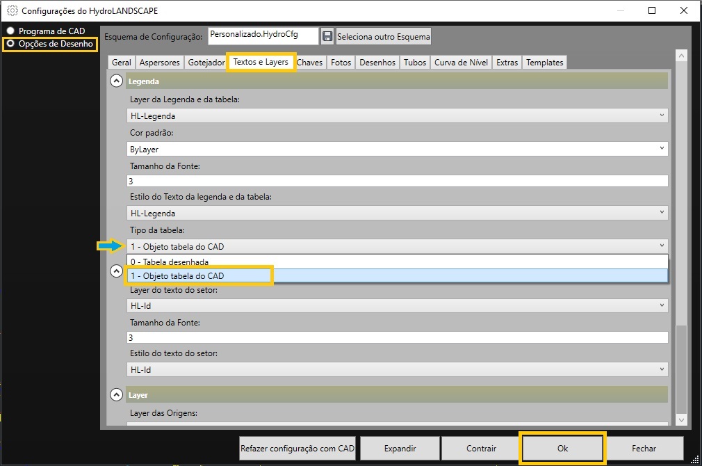 Em Opções de Desenho entre na aba Textos e Layers, no Menu Legenda marque a ultima opção onde aparece Tipos de Tabela selecione a opção 1- Objeto tabela do CAD em seguida aperte OK. Desta forma estará concluído o procedimento de configuração da tabela de quantificação.