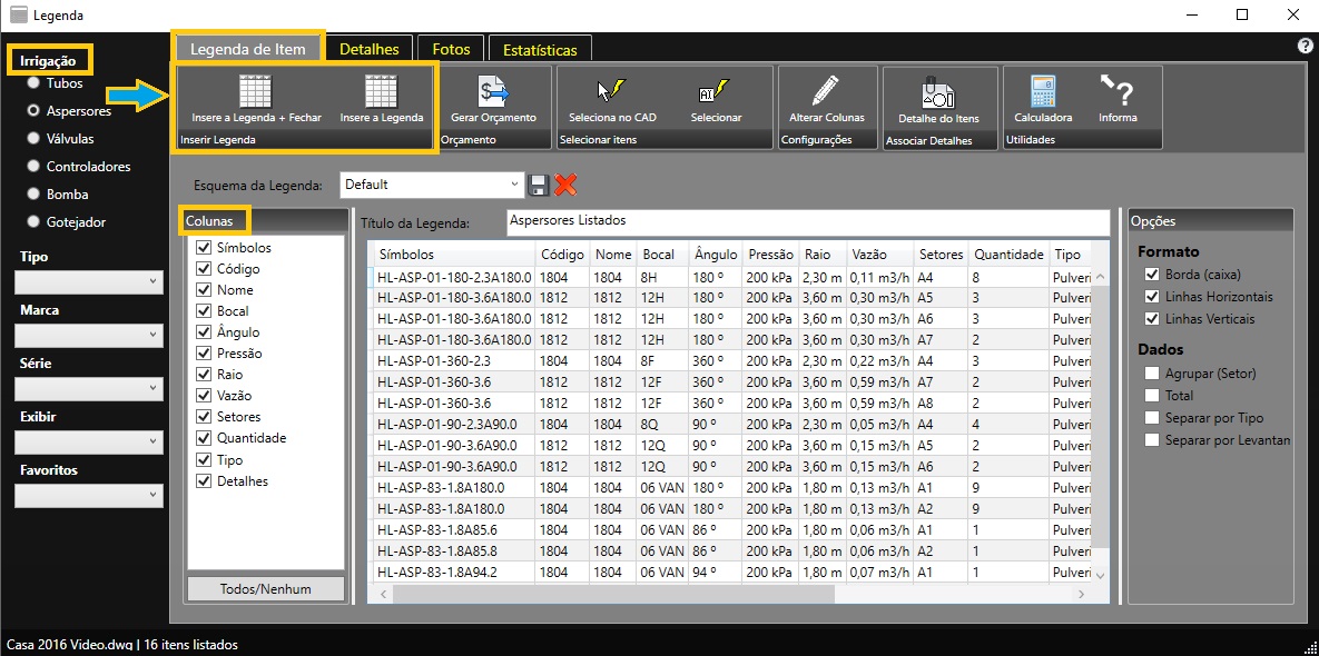 Em seguida irá aparecer o quadro de quantificação e legenda dos itens. Para inserir a tabela no projeto do AutoCAD basta clicar a aba Legenda do Item, em Irrigação marque item que deseja quantificar, em Colunas as especificações a serem listadas na tabela. E para inserir a tabela no projeto selecione opção Inserir a Legenda . Como mostra a imagem abaixo.
